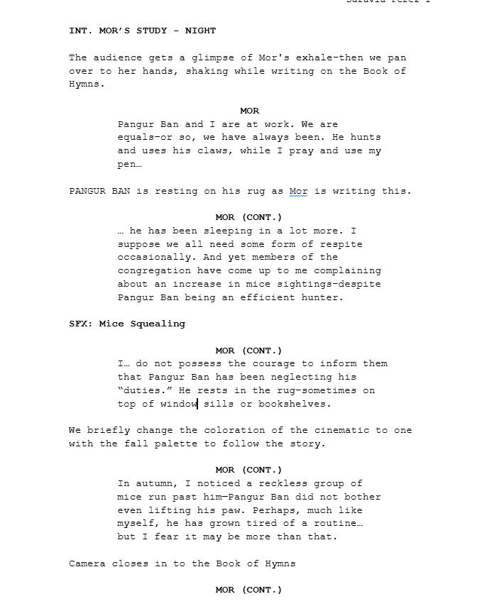 Reborn: A Pangur Ban Story is a narrative-driven platform game developed in Unity. I was inspired by the poem--Pangur Ban--where an Irish priest wrote about his white cat. Using JSTOR databases, academic articles, journals and other resources. Thanks to these resources, I was able to design quests where the player could interact in a way that was similar to a cat walking around an Irish abbey in the 900s.I was able to provide the art team a description of what an abbey at the time was like, and the day in the life of a church member. Though we took some creative liberties, we made sure that the environment, sound design, music, architecture and art was as accurate as possible.