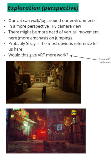 For the Reborn: A Pangur Ban Story project, I was inspired by how cats (like our protagonist) navigate the world.Cats like to remain in "medium" altitude--not necessarily on the floor, or on the ceiling, but more so on shelves when they are acclimated to the indoors.So we placed several clues that the player could interact with to piece together the story of what happened to Pangur Ban in this story.