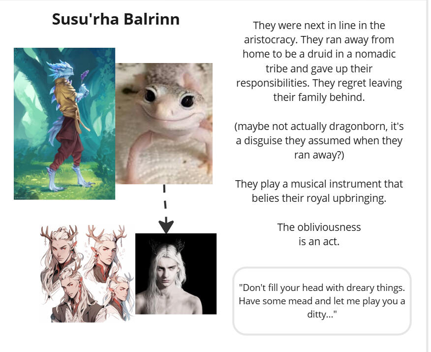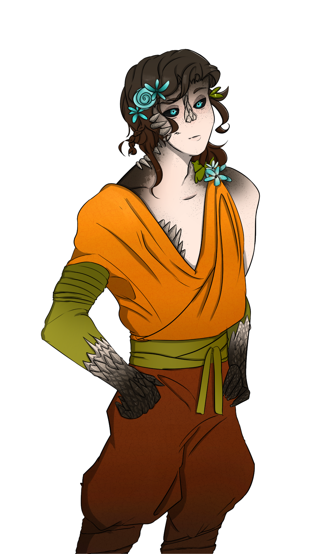 During the brainstorming stages of our second intellectual property, I established the groundwork and created the original concept of Susur'rha: a nonbinary dragonborn druid, who is one of the three romanceable characters of the Lovecraftian dating sim: The Ouroboros Express.
