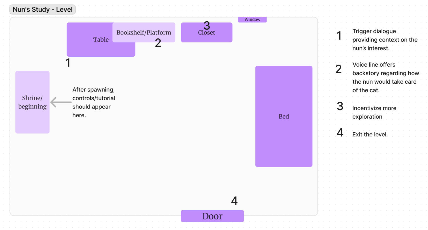Along with the artist, I designed the levels in the abbey and the quests in each of them.The room of the priest focused on exploration and backstory. Using historical resources, we made sure that the room had obstacles that the player had to overcome to complete different parts of the main quest.By having a cat as a protagonist and player character, this informed the traversal, mechanics and player experience.