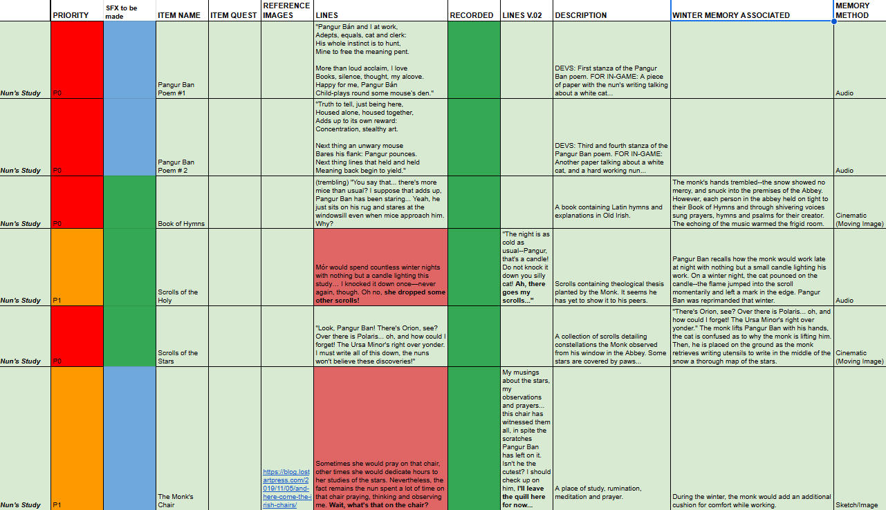 Barks were triggered upon interacting with items in the game, and completing quest goals. The Narrator character was based off of the "monk" character in the original Pangur Ban poem, but we took the creative liberty to adapt the story into that of an Irish nun instead.Voice over direction was provided to the talent, who recited the lines provided in the script.