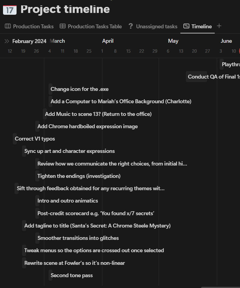 In order to have a complete, playable project by the end of the deadline, I planned extensively the a cross-department timeline and pipeline, then shared it with the team. This was completed in tandem with the game design document featuring the systems, mechanics, features, characters, plot and story of the game.