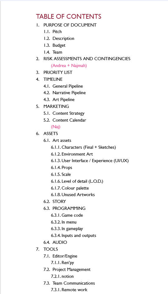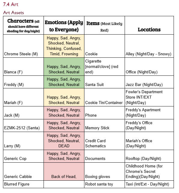 To establish the art direction of Santa's Secret, the art team and I decided on a black, white and red palette with hues of navy blue. The lack of saturation offered a noir feeling to the game, which was enhanced by the use of a font similar to that of a typewriter. Mockups and tests were shared in the Game Design Document, which can be seen here.Below is the table of contents, and part of the art asset list in the GDD.